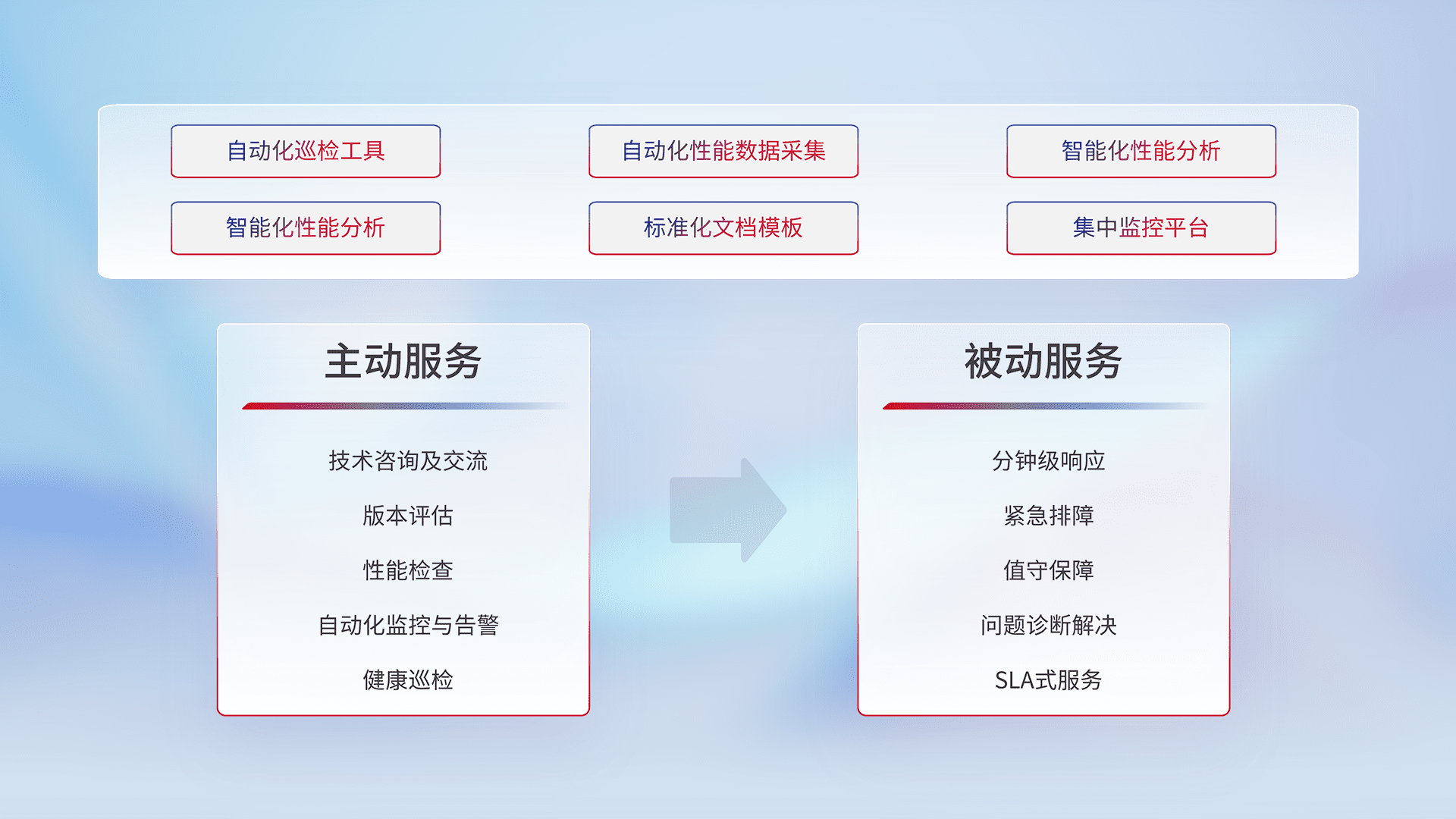 智能化工具和标准化文档,,,,保障服务质量,,,,提供主动服务(包含技术咨询、、、、版本评估、、、、性能检查、、、自动化监控与告警、、健康巡检)和被动服务包含(分钟级响应、、、、紧急排障、、值守保障、、问题诊断解决、、、、SLA服务)。。。。