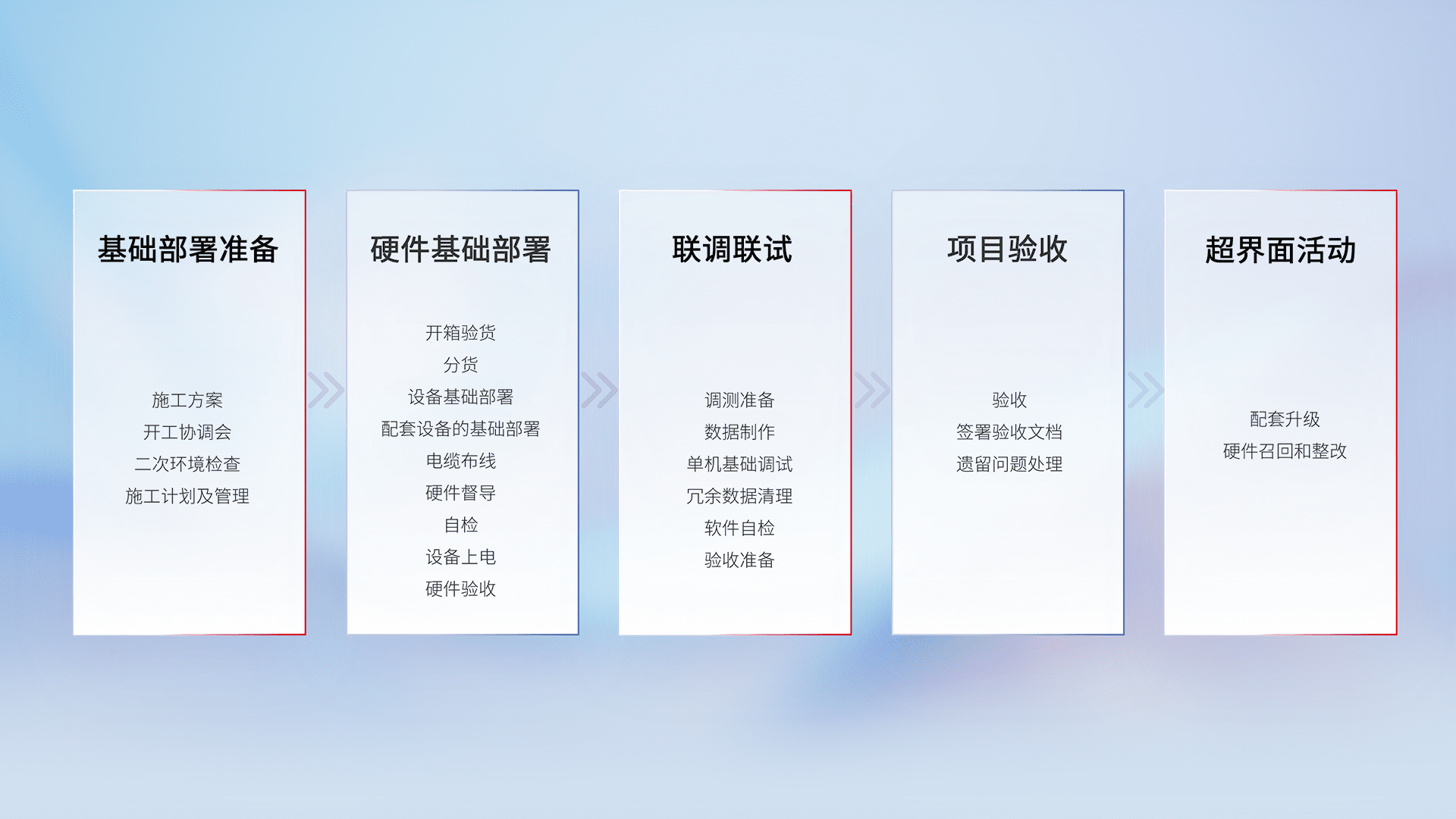 从基础部署准备、、硬件基础部署、、、联调联试、、项目验收、、越界面活动的全过程可追溯,,,,保证施工质量和进度。。。。